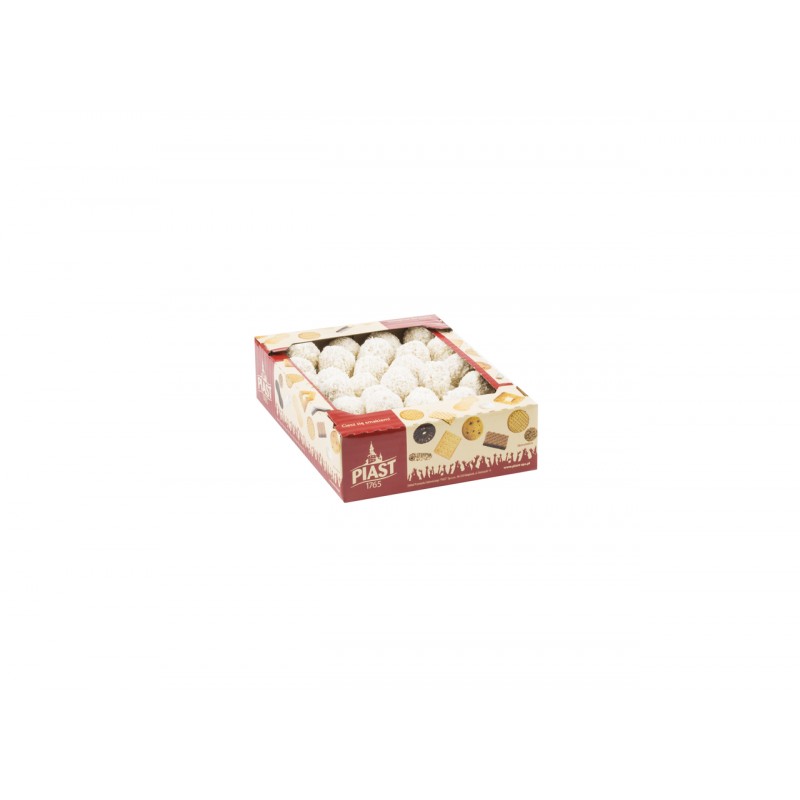 Rozpływająca się w ustach kulka z nadzieniem kokosowym, oblana polewą kokosową i posypana wiórkami kokosowymi Idealna do kawy, herbaty czy jako wyśmienity dodatek do lodów i deserów
