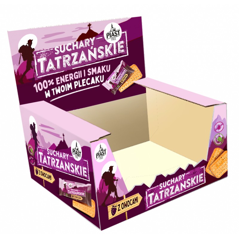 Suchary Tatrzańskie z owocami 70g. Chrupiące suchary wzbogacone suszonymi owocami. Lekko słodkie, idealne na wędrówki górskie.