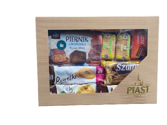 W skład zestawu wchodzą : 1 szt. Piernik z Głogówka ręcznie robiony 230g 1 szt. Suchary SU-2 90g 1 szt. Suchary SU-1 45g 1 szt. Leonki 90g 1 szt. Szampanki 105g 1 szt. American Cookies with Chocolate 150g 2 szt. Petit Beurre w polewie 80g 3 szt. Rewelki paczkowane (wybierane losowo :z kawałkami czekolady185g/z ziarnami180g/z cukrem165g/z orzechem180g/z kokosem165g/z dodatkiem kakao175g)